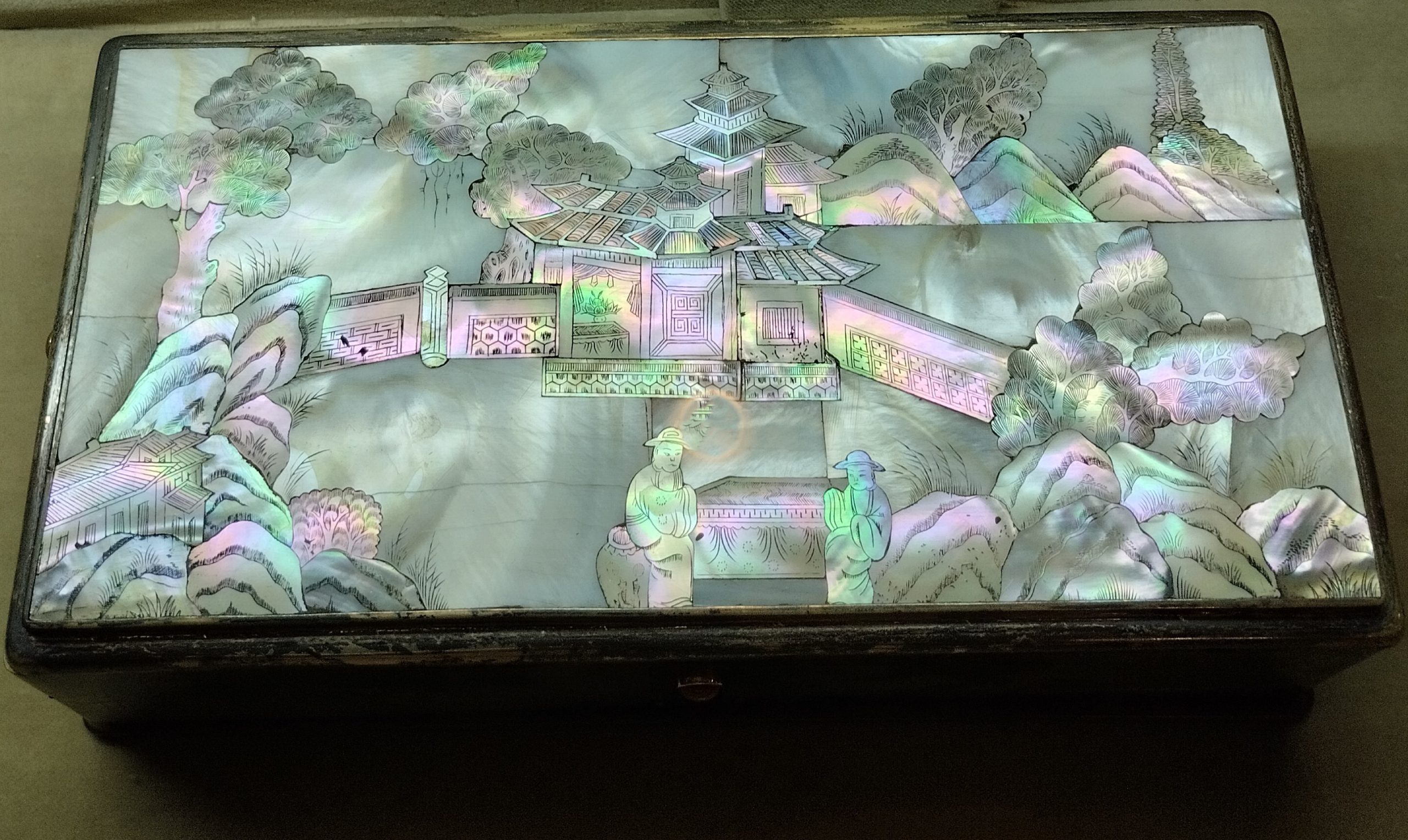 روی جعبه صحنه ای از مناظر و معماری شرقی ( به سبک چینی / ژاپنی ) دیده می شود.