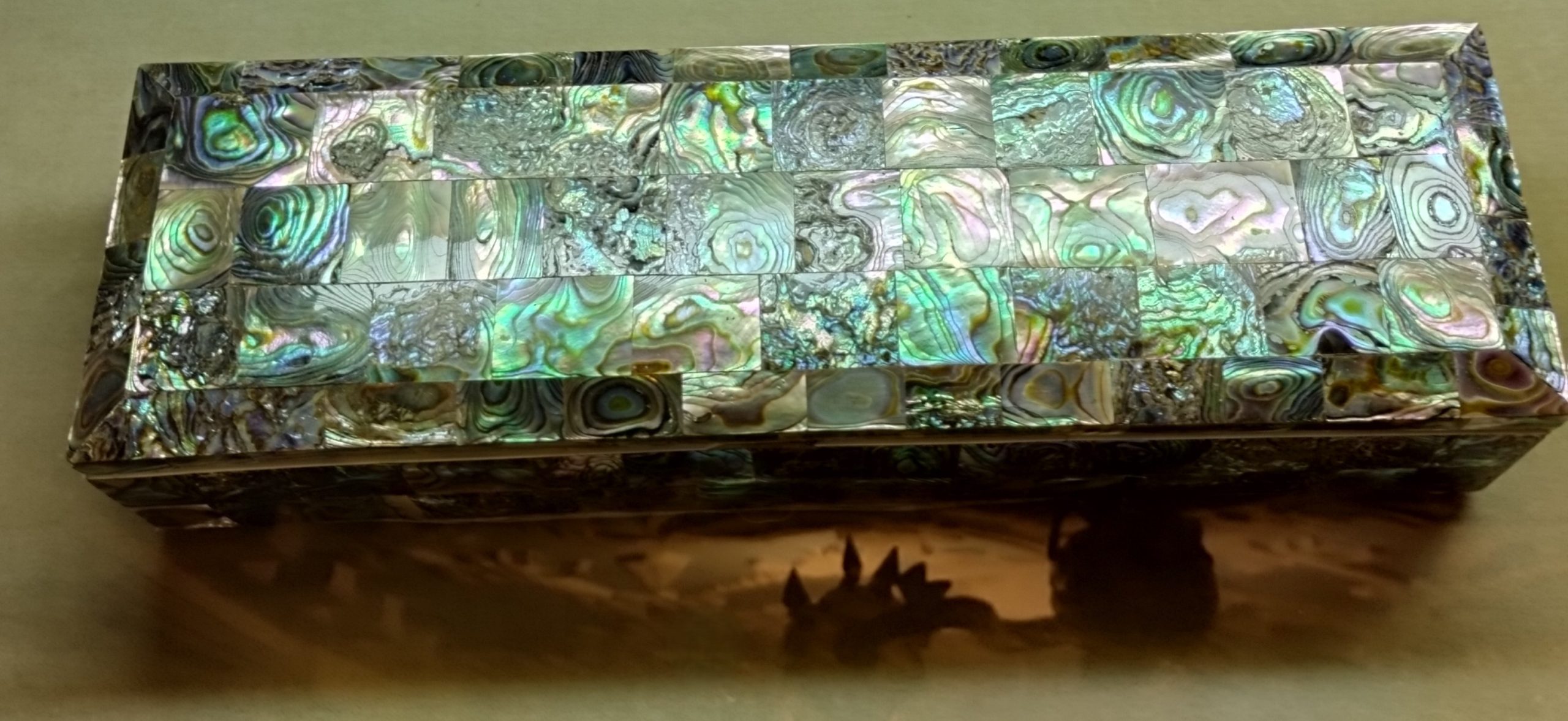 روکش صدفی: سطح جعبه با قطعات صدف طبیعی بریده و صیقل داده شده، به شکل موزاییکی کنار هم قرار گرفتهاند.